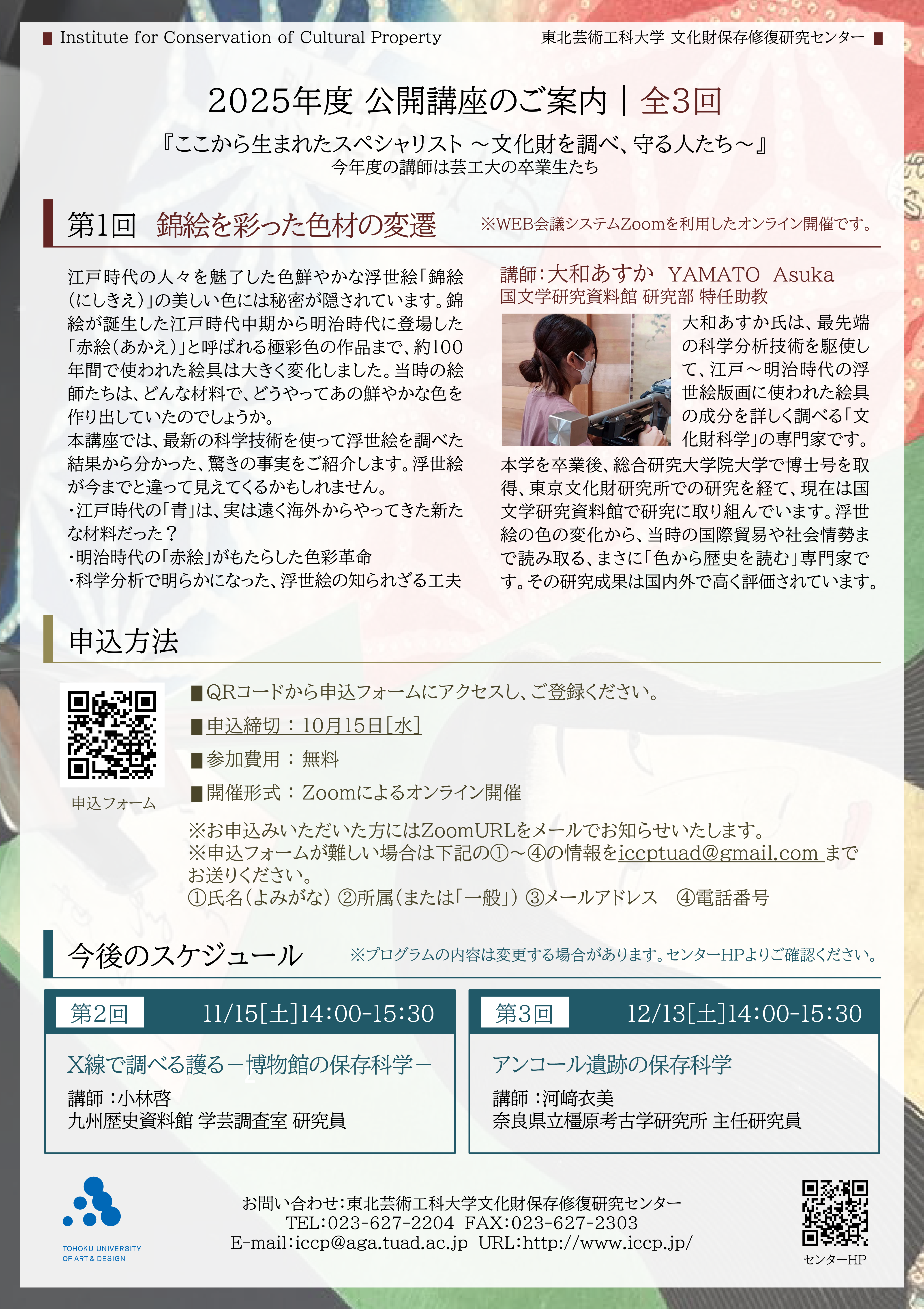 今年度の公開講座・第1回は『錦絵を彩った色材の変遷』です。2014年に東北芸術工科大学 芸術工学研究科 芸術文化専攻 保存修復領域修士課程を修了された大和あすかさんが、現場で培った知見をもとに、わかりやすくお話します。